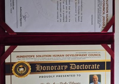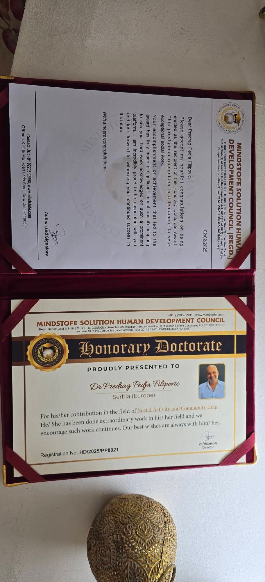 Pedji Filipoviću dodeljena je u Indiji počasna titula Dr i stigla je na beogradsku adresu. Midstore Solution Human Development Council nagradio je, poštujući njegov rad i posvećenost, rezultate rada, naseg Wellness Ambasadora za 36 godina doslednog, najkvalitetnijeg rada u oblasti edukacija manuelnih terapeuta, kreatora wellness koncepata, humanitarni rad… Počastvovani smo i zahvalni!