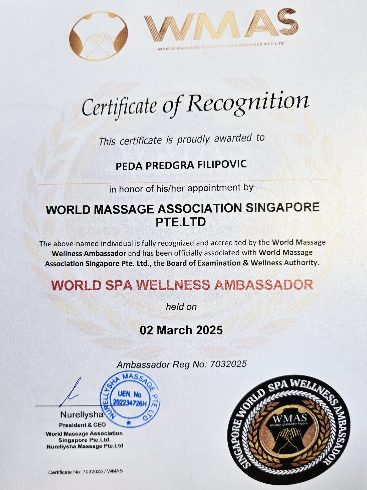 Priznanje dodeljeno od Svetske Asocijacije Masera Singapura WMAS i World Massage Championship Competition marta 2025.godine.
