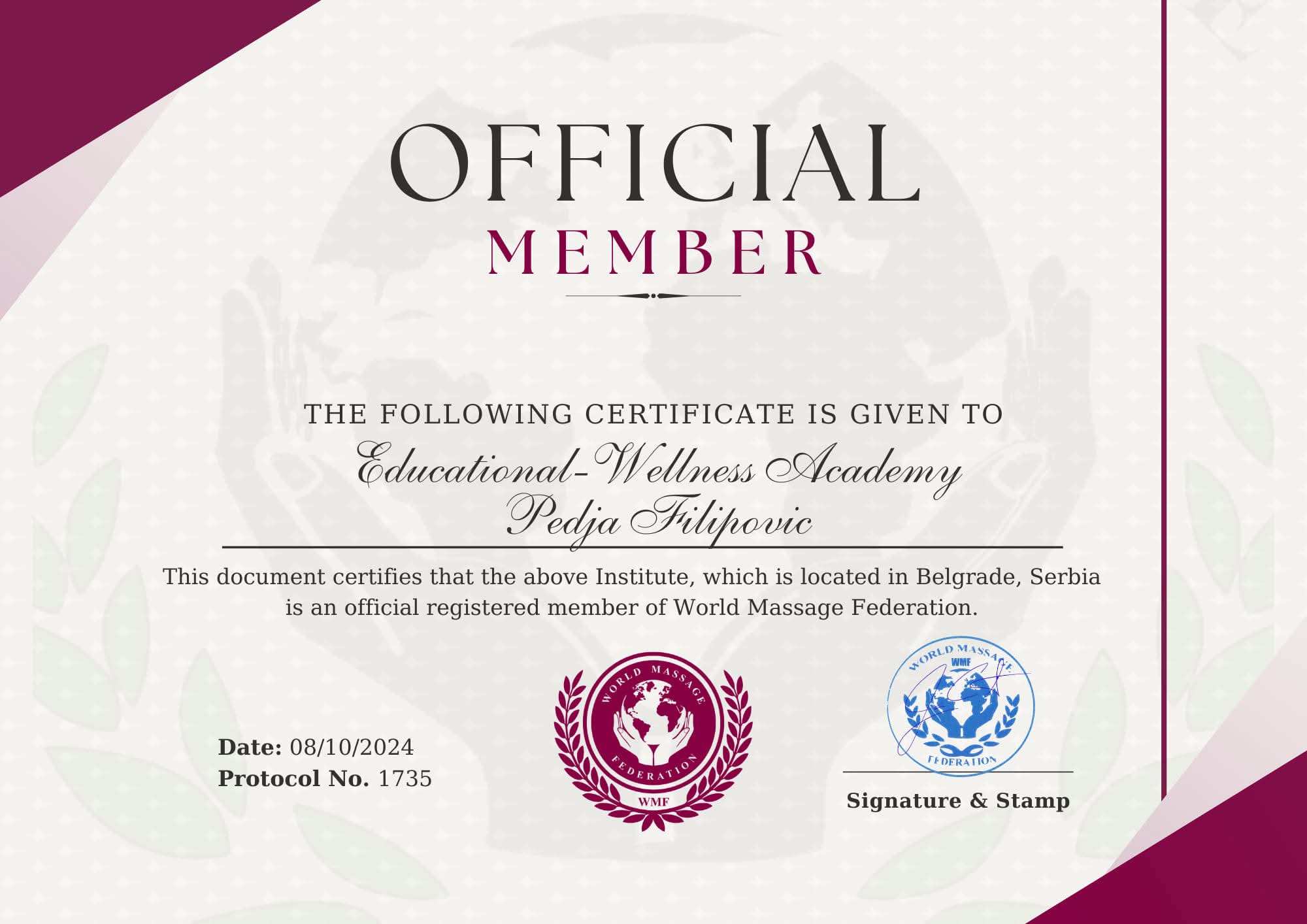 Wellness Akademija Pedja Filipović od oktobru 2024.godine zvanični član je najprestižnije organizacije masera World Massage Assotiation sa sedištem u Atini!
